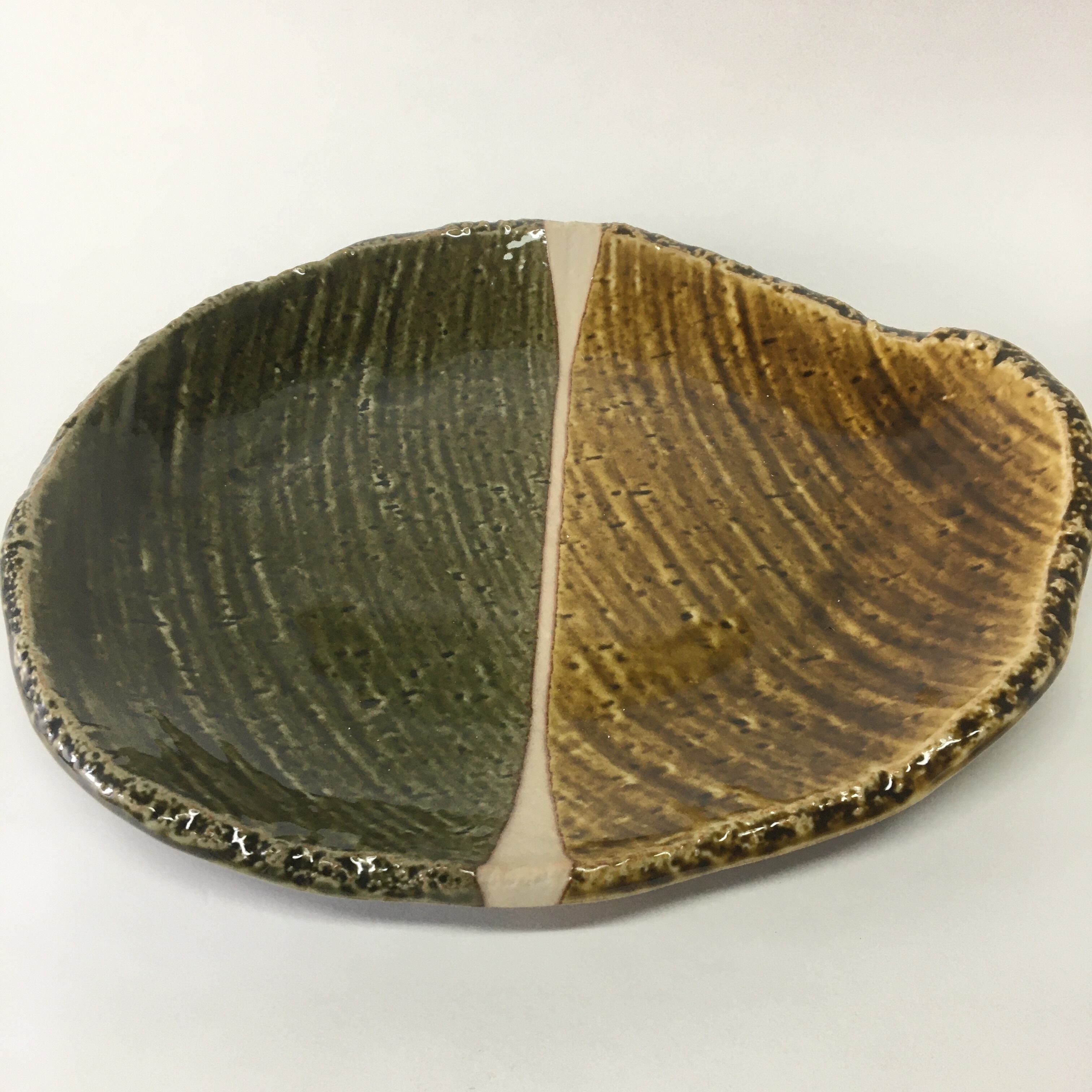 民芸の塗り分け技法をカジュアルモダンスタイルで表現したシリーズです。二色の釉薬を丁寧に塗り分け、間を空けることで生地の質感を残しました。三色が柔らかい表情をおりなしています。